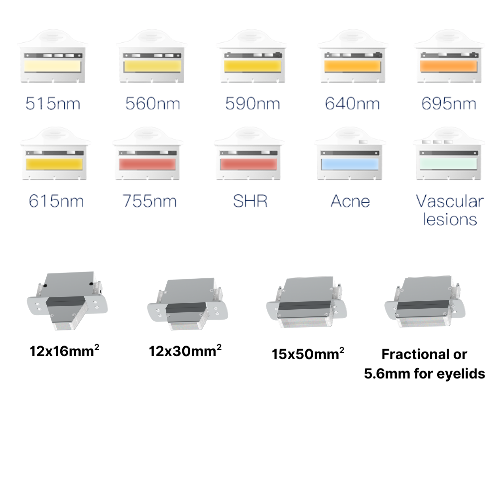 Acne: (400-600 & 800-1200); Vascular (530-650 & 900-1200); 515 nm, 560 nm; 590 nm; 615 nm; 640 nm; 695 nm; 755nm; SHR